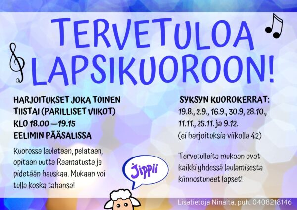 Lapsikuoron syyskausi käynnistyy elokuussa, ja iloiseen joukkoomme ovat tervetulleita kaikki yhdessä laulamisesta kiinnostuneet lapset! Aiempaa kokemusta ei tarvitse olla, vaan mukaan saa tulla aivan ensimmäistä kertaa.